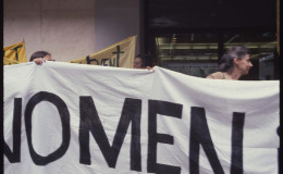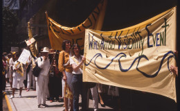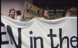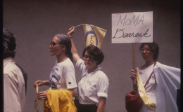 On June 15, 1984 the WAVE (Women Artists Visibility Event) also known as Let MoMA Know took place in New York City in front of the Museum of Modern Art. The event was organized by artists Sabra Moore and Betsy Damon, and art historian Annie Shaver-Crandell through the New York City chapter of the Women’s Caucus for Art. I shot photos of the protest and now, 30 years later, I am compiling a list of names of the women pictured in my photographs. The photographs are archived at the Duke University Sallie Bingham Center for Women’s History and Culture and the names collected will be added.