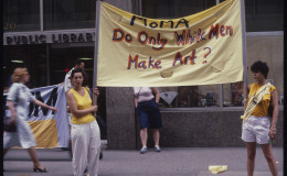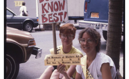 - Susan Miller (left) and Maria Elena Gonzalez (right) holding banner “MOMA – Do Only White Men Make Art?” – across the street from MOMA entrance.